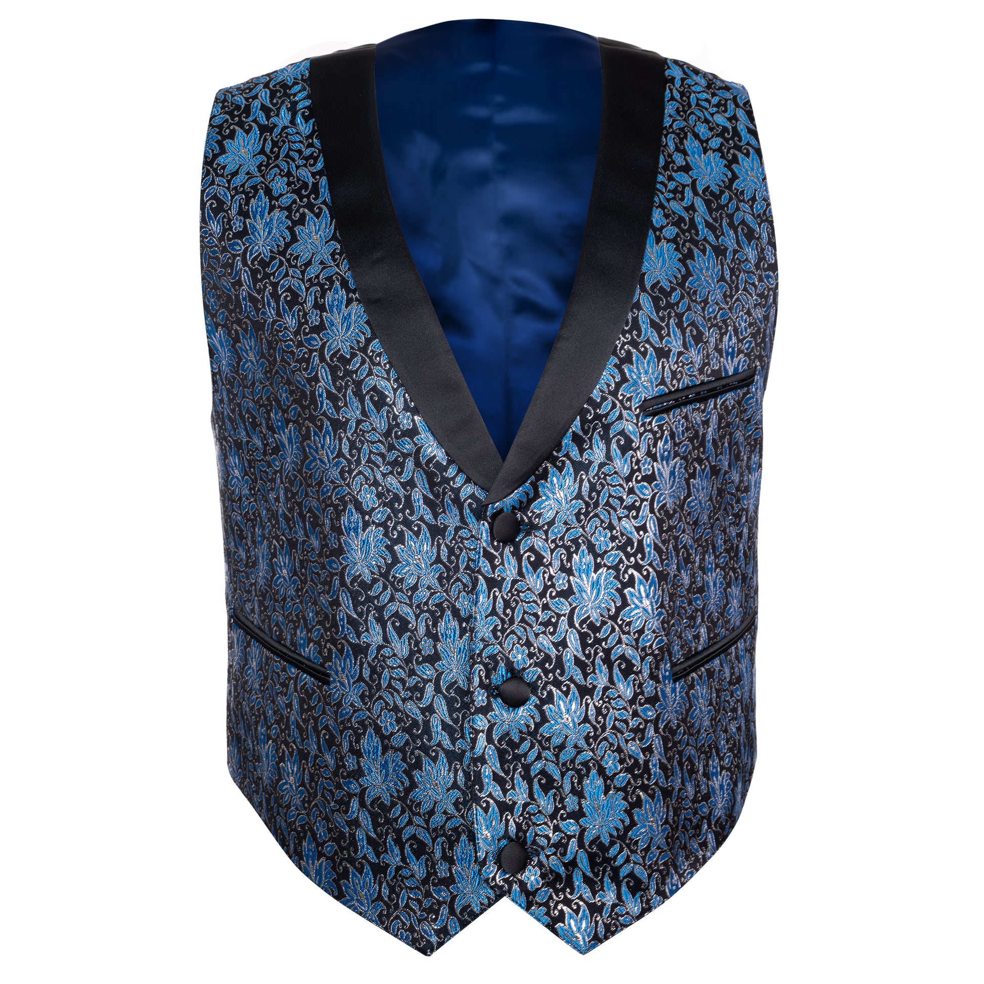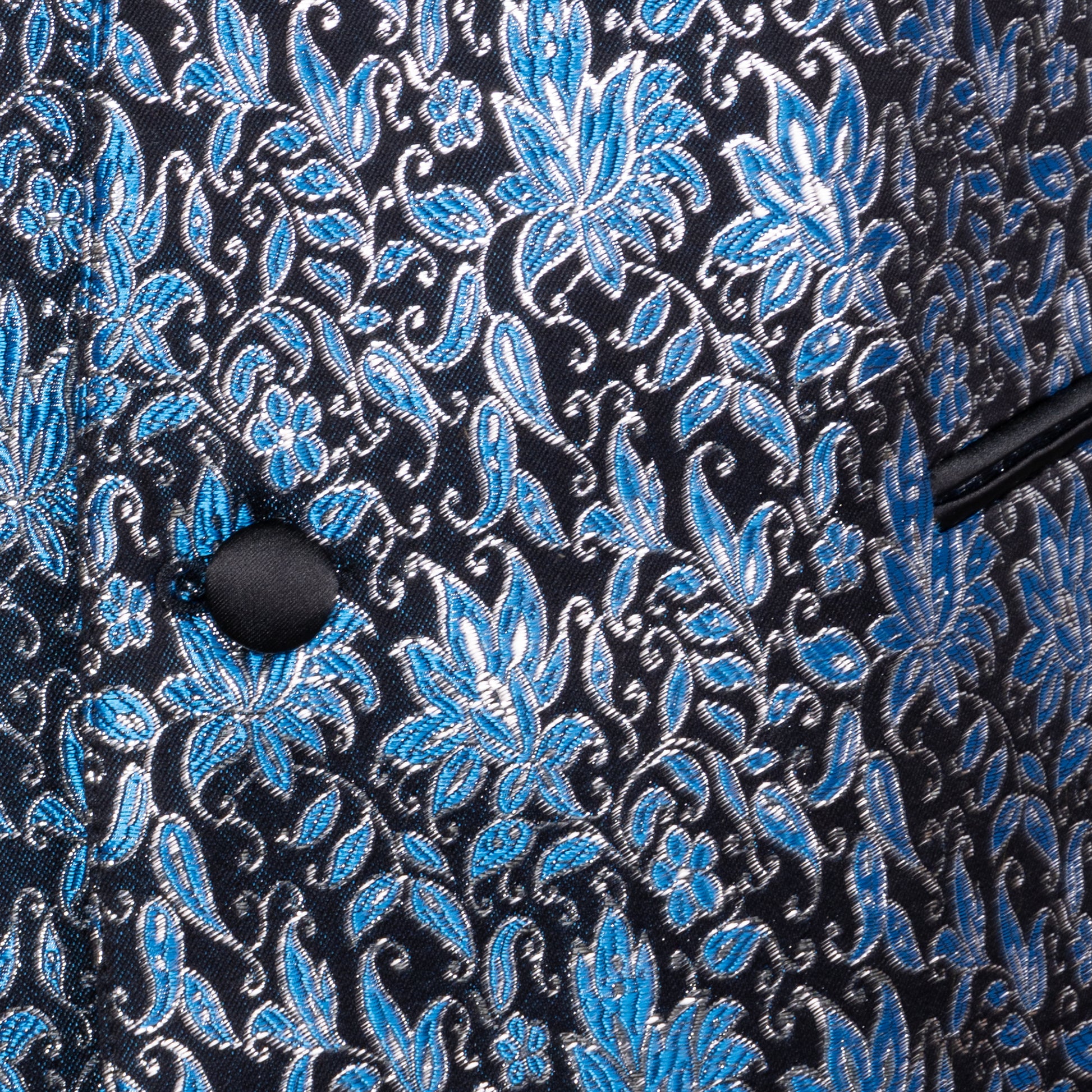 - Exquisiter Jacquard-Stoff: Vorderteil mit einem kunstvollen, floralen Muster in leuchtendem Königsblau und Silberlinien auf schwarzem Grund.
