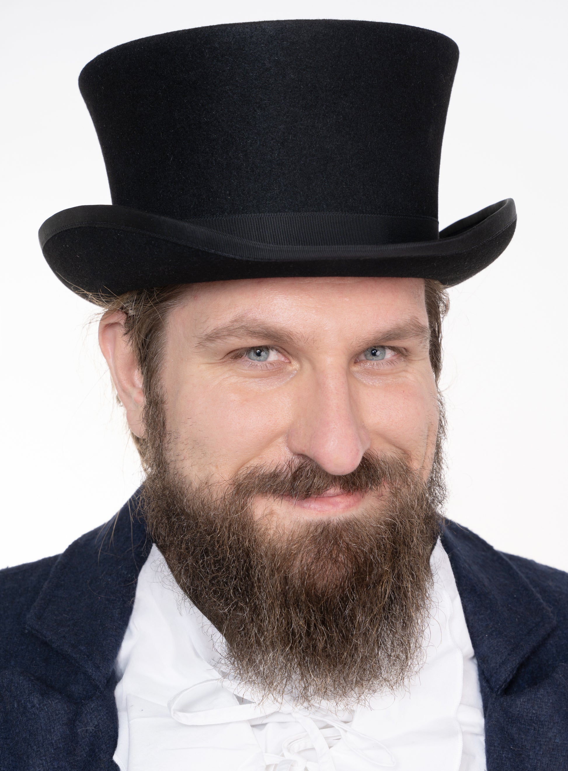 Weniger opulent als sein viktorianischer Nachfolger, aber nicht minder elegant: Der Biedermeier-Zylinder ist ein Zeichen für subtilen Stil und klassisches Understatement. Dieses Modell mit flacherer Krone war er die bevorzugte Kopfbedeckung des Herrn in einer Epoche, die Wert auf bürgerliche Eleganz legte. In unserer Altenburger Manufaktur fertigen wir diesen Zylinder in seiner historischen Form und den bewährten Techniken des Hutmacherhandwerks, das wir seit 1876 pflegen.