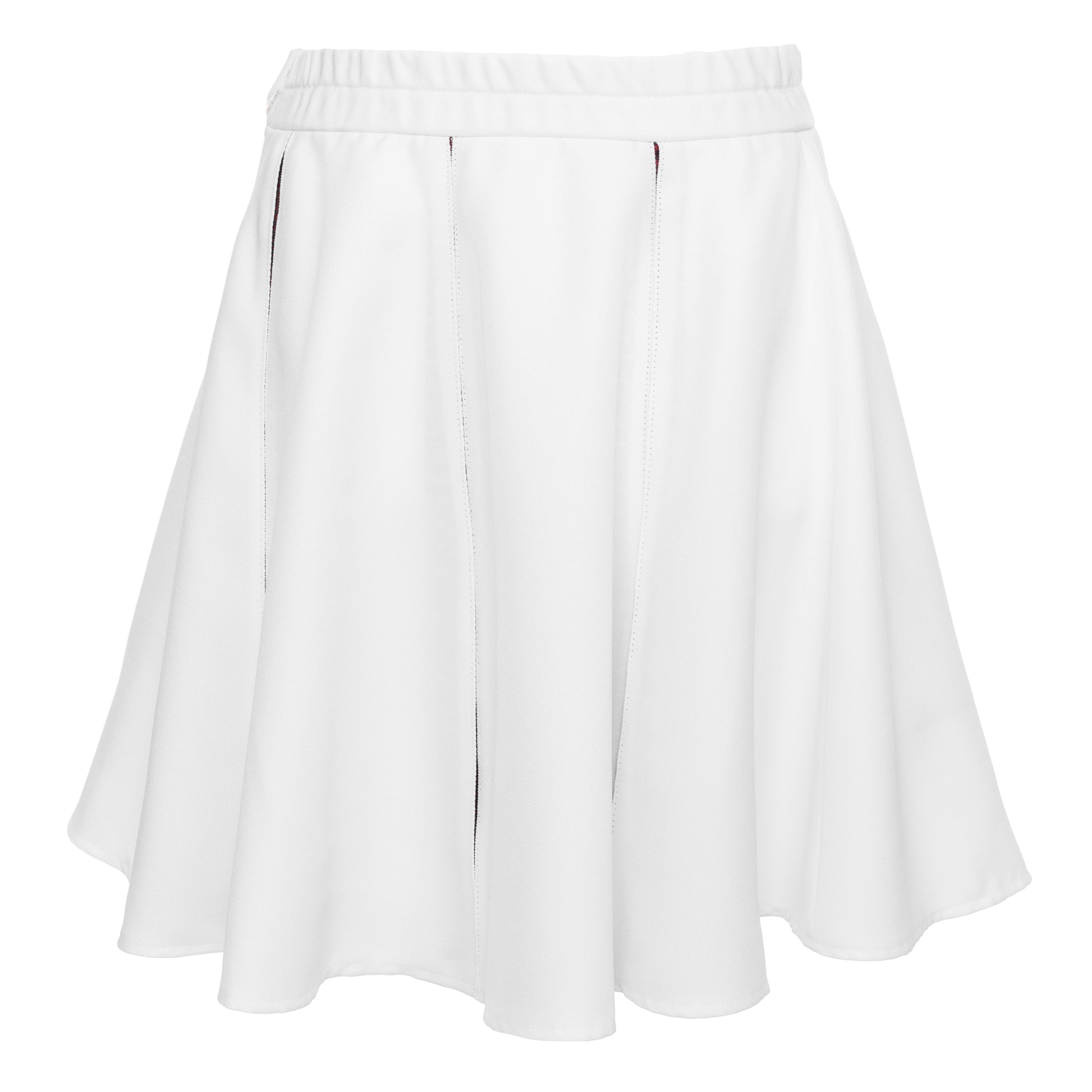 Tanzrock: Kurzer, weit geschnittener Tellerrock aus blickdichtem, weißem Stoff, der für optimalen Schwung und Beinfreiheit sorgt.