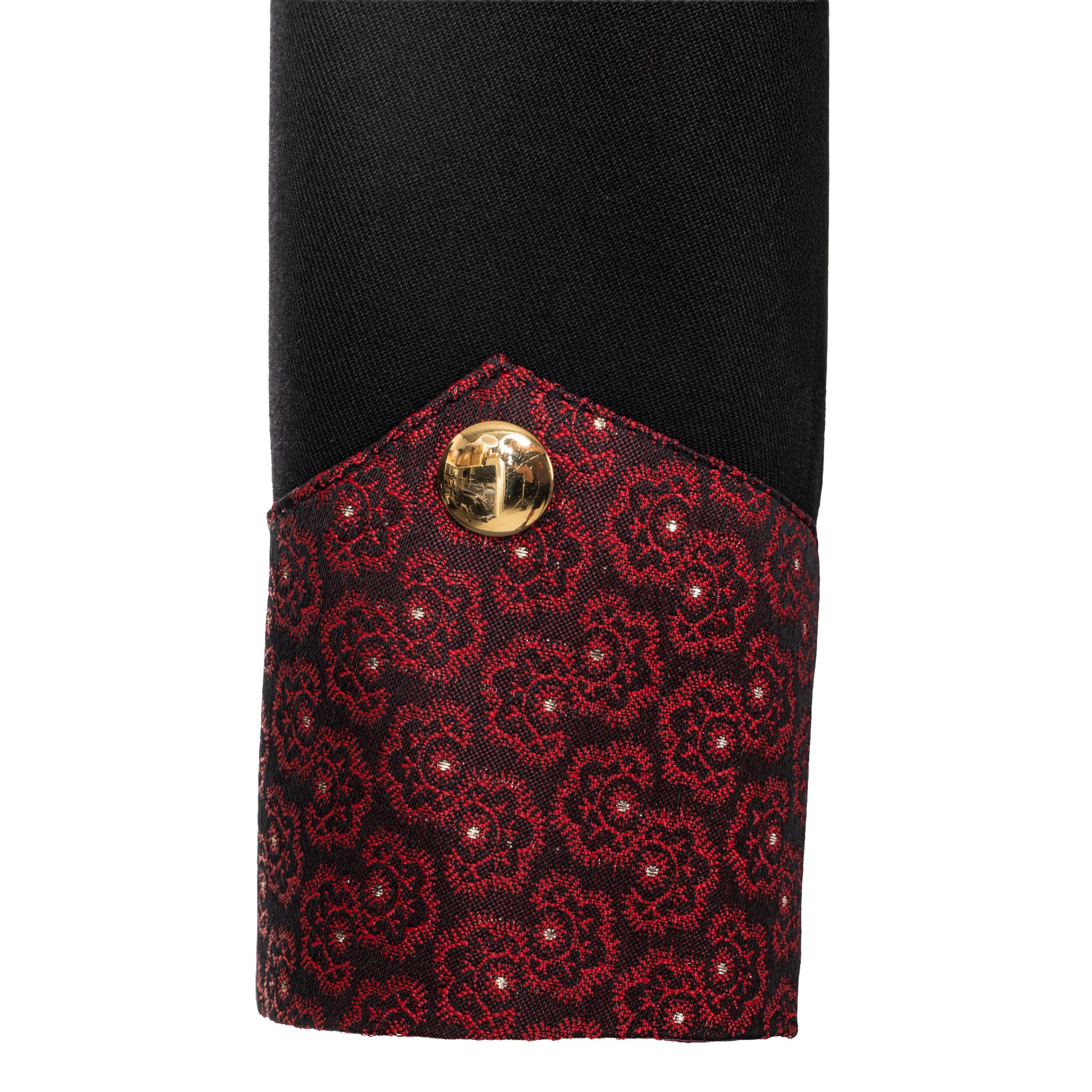 Das Herzstück dieses Ensembles ist die kunstvoll gearbeitete Uniformjacke. Auf der Basis aus tiefschwarzem Uniformtuch entfaltet sich eine prachtvolle, goldene Husarenverschnürung, die einen Brusteinsatz aus edlem, rot-goldenem Brokat rahmt. Dieses Motiv wiederholt sich am hohen Stehkragen und den breiten Ärmelaufschlägen. Jede Naht, jede Borte und jeder der gewölbten Zierknöpfe ist mit der Präzision und Sorgfalt gefertigt, die Sie von einem Traditionsausstatter seit 1876 erwarten dürfen. Ein robuster Front-Reißverschluss sorgt dabei für Funktionalität und schnelles Umkleiden.