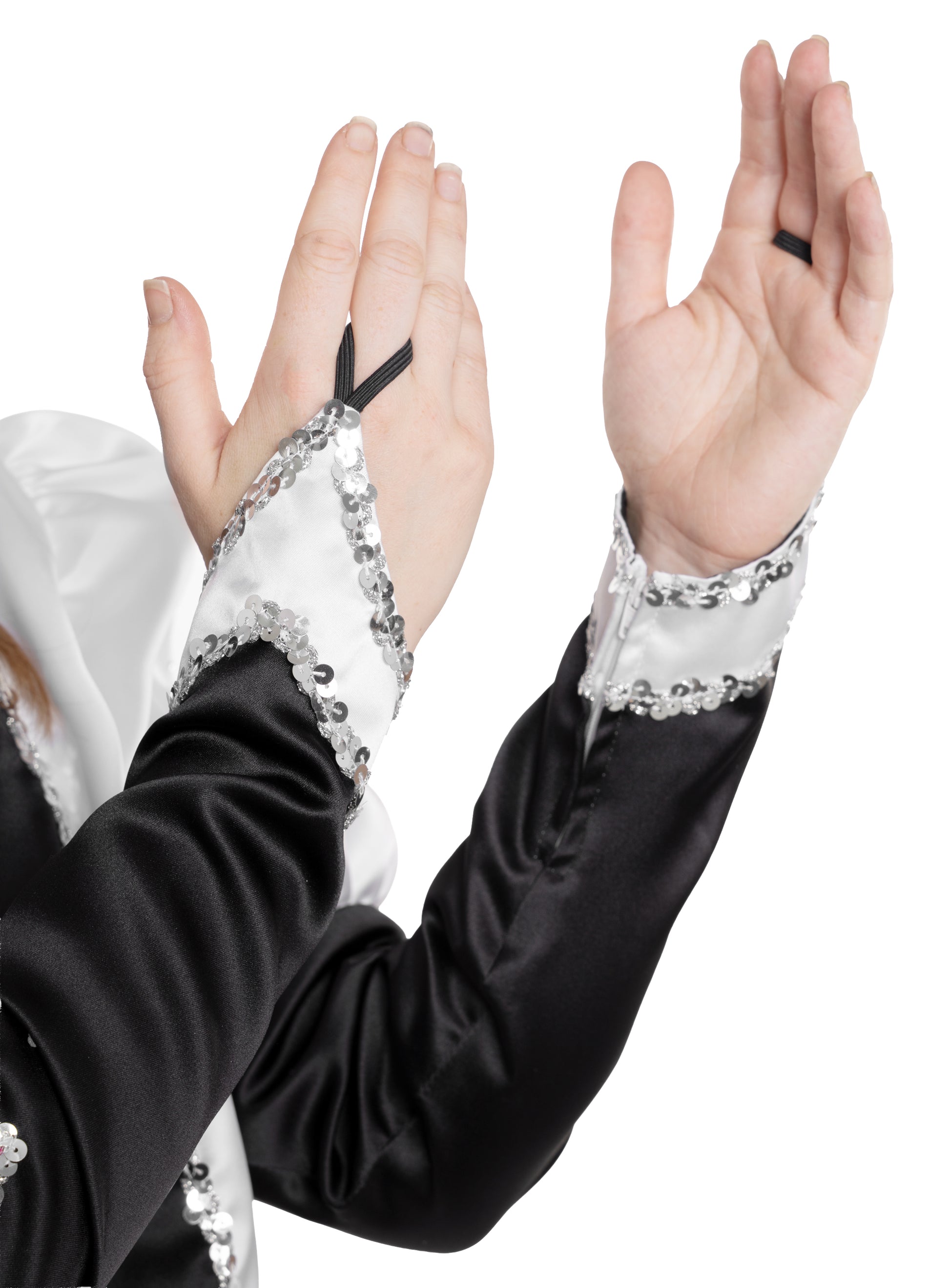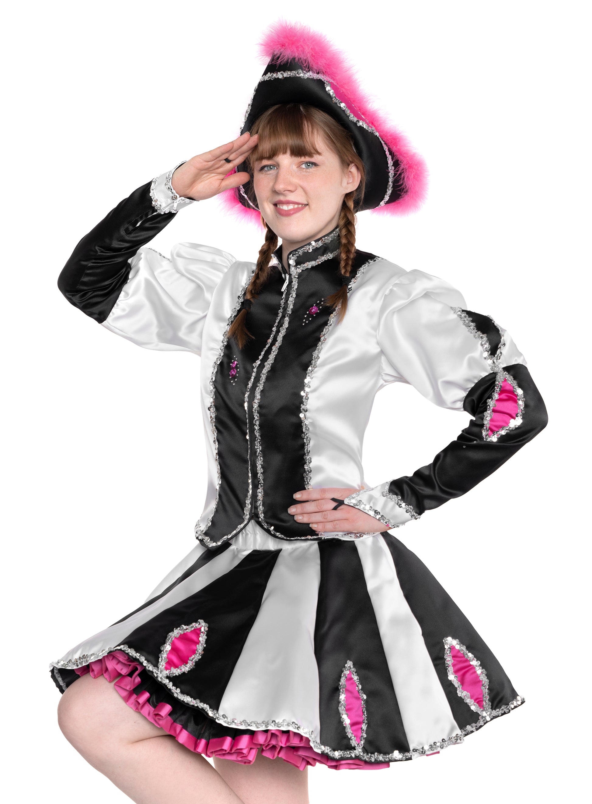 Dieses extravagante Gardekleid in Schwarz-weiß besticht durch auffällige rosa Blumenmotive, die dem Design eine besondere Eleganz verleihen. Die silberne Pailettenborte setzt funkelnde Akzente und sorgt für einen glamourösen Auftritt. Ideal für Gardetänze, verbindet das Kleid stilvolle Optik mit hochwertiger Verarbeitung für optimalen Tragekomfort und Bewegungsfreiheit.