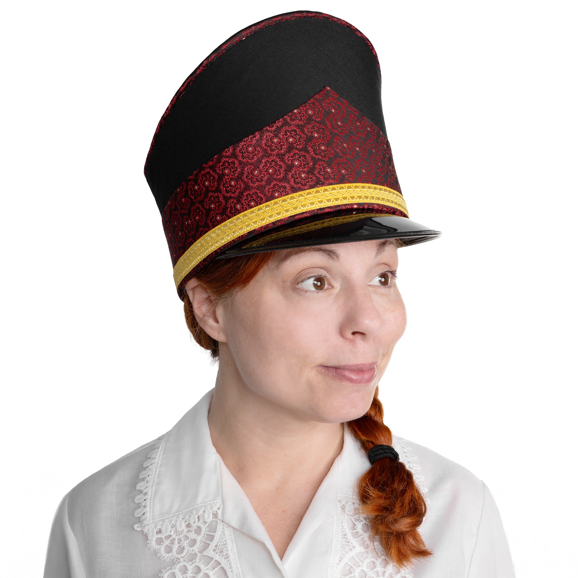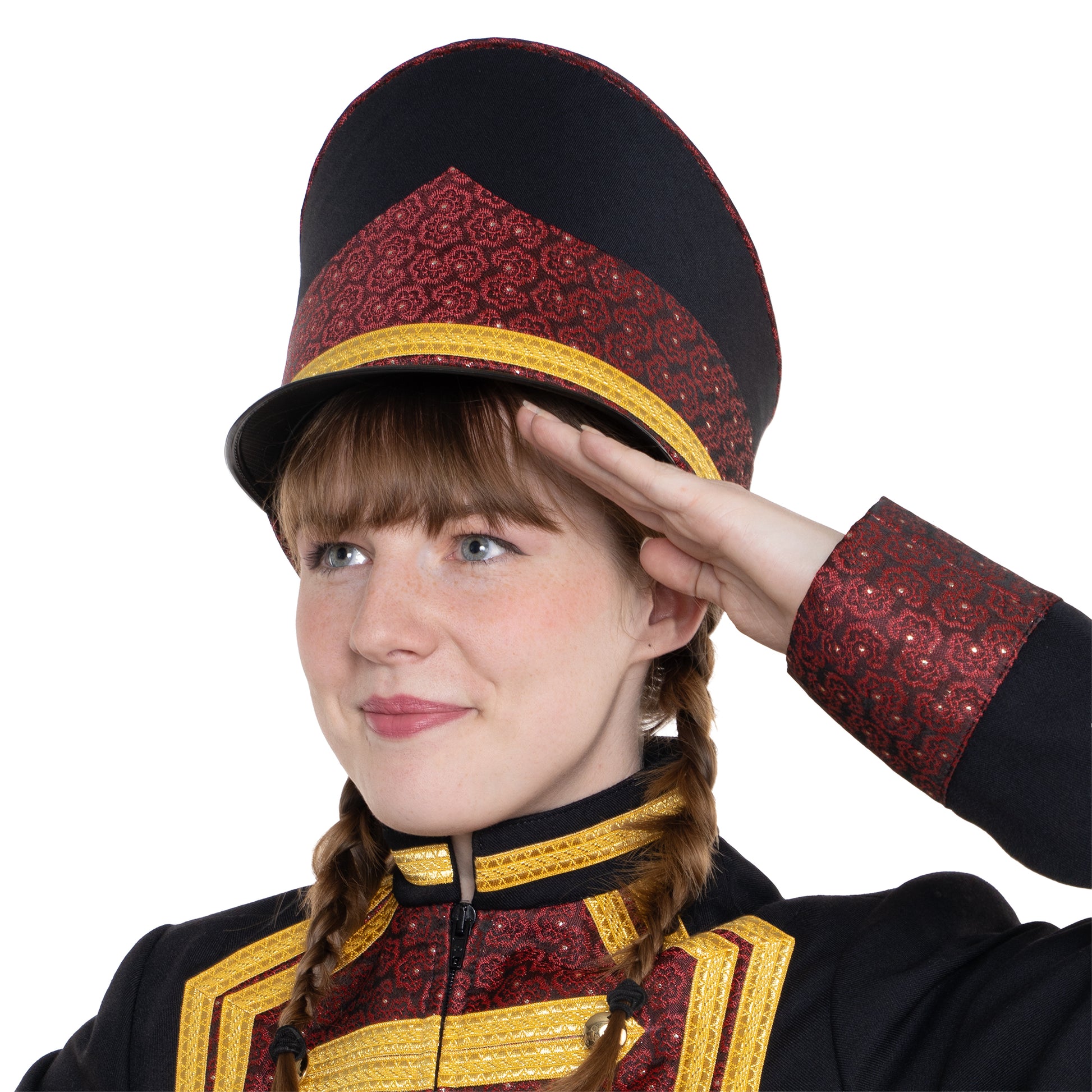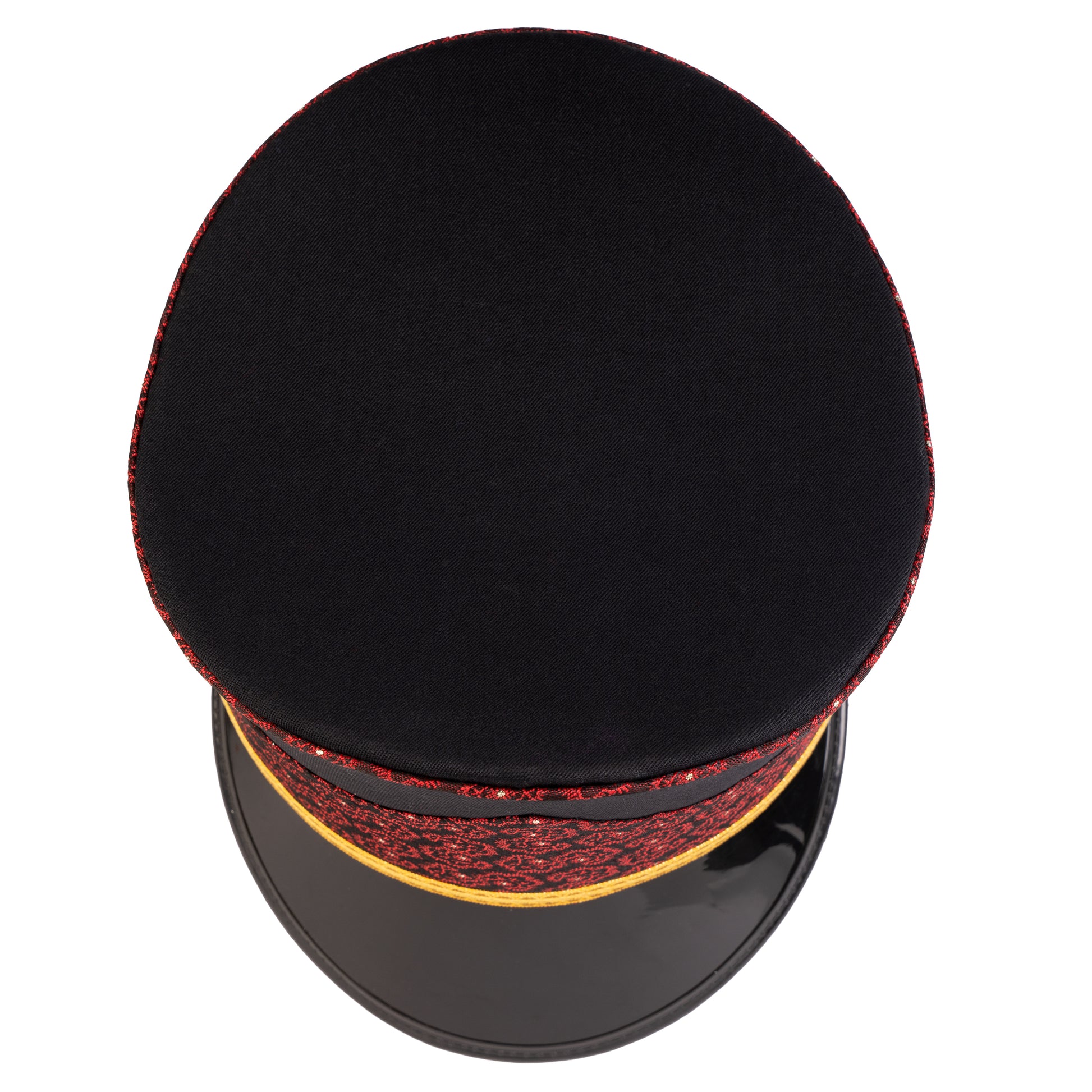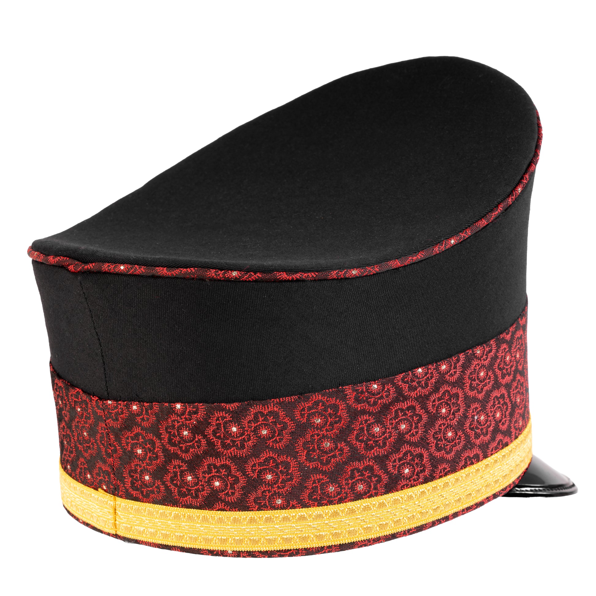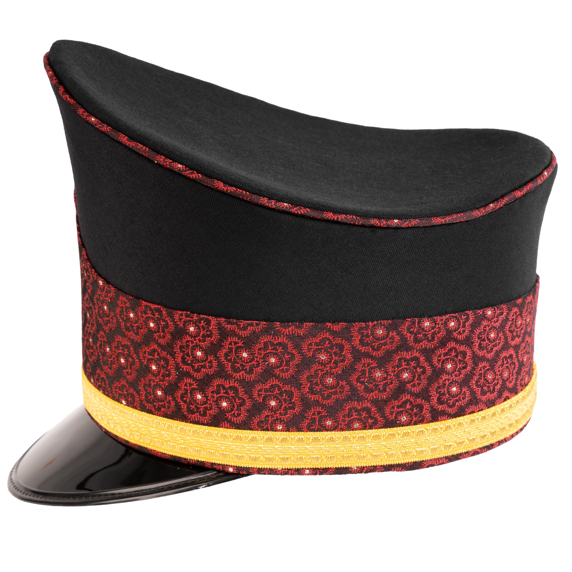 Gardetschako für Damen - Schwarz mit floralem Bordeauxstoffbezug und Goldkrempe