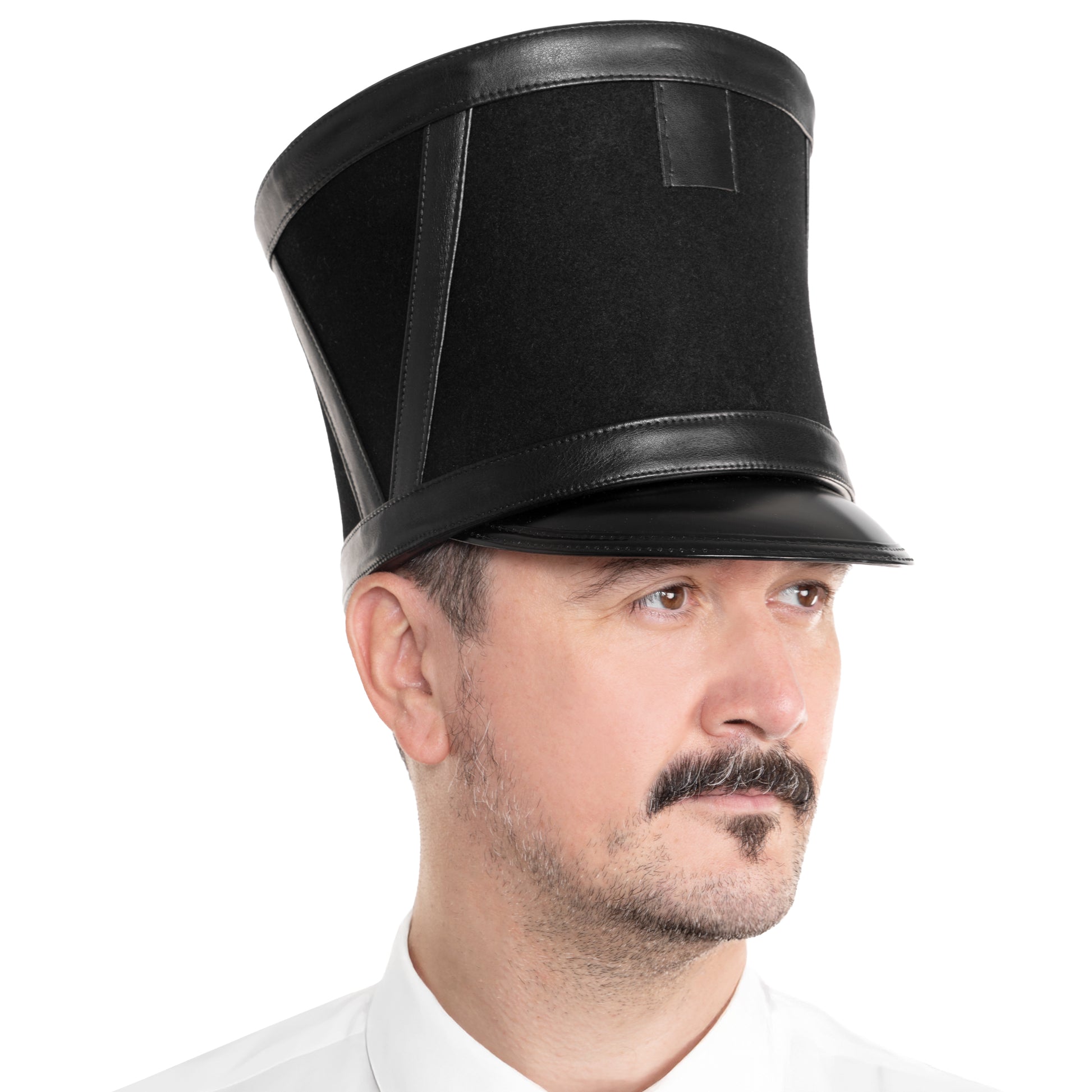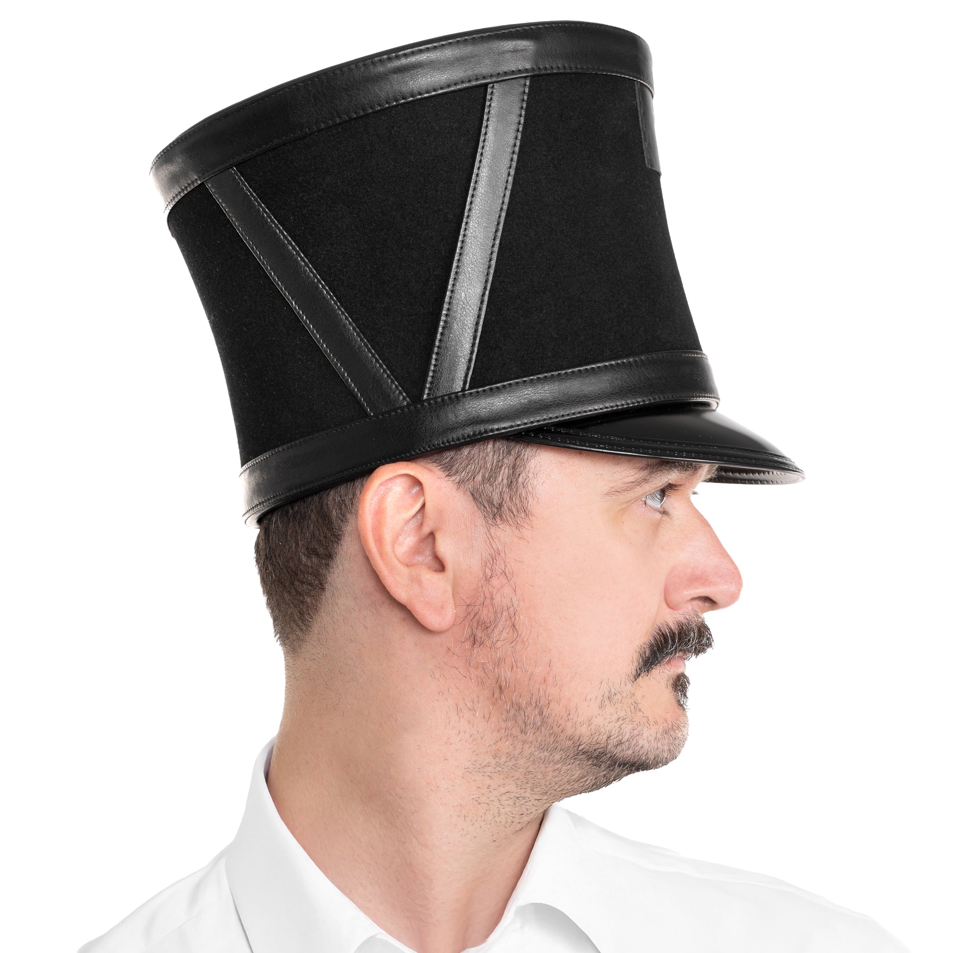 Dieser Tschako in Schwarz mit an den Seiten aufgenähtem V-Muster bietet klassische Eleganz mit praktischer Funktionalität durch die integrierte Federtasche. Die robuste Verarbeitung gewährleistet Langlebigkeit, während das zeitlose Design sich ideal für traditionelle Uniformen und historische Kostümierungen eignet. Ein unverzichtbares Accessoire für authentische Darstellungen mit professioneller Qualität.